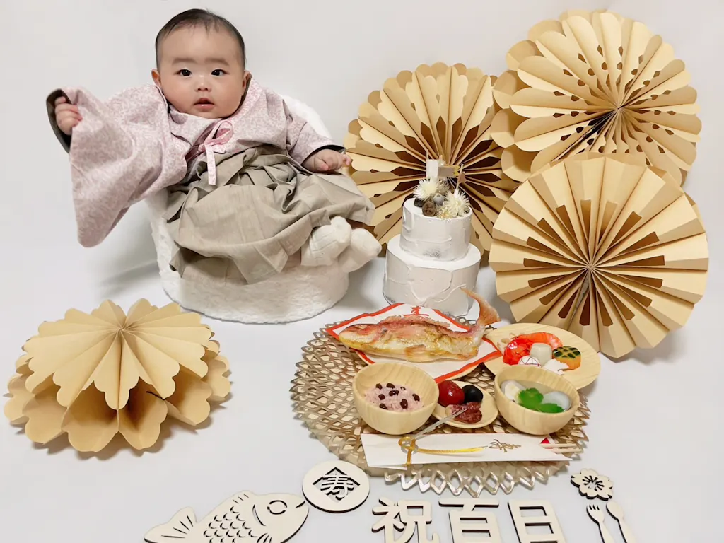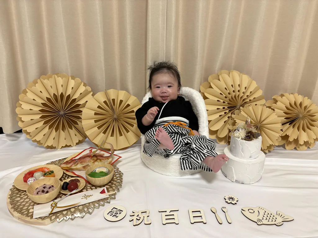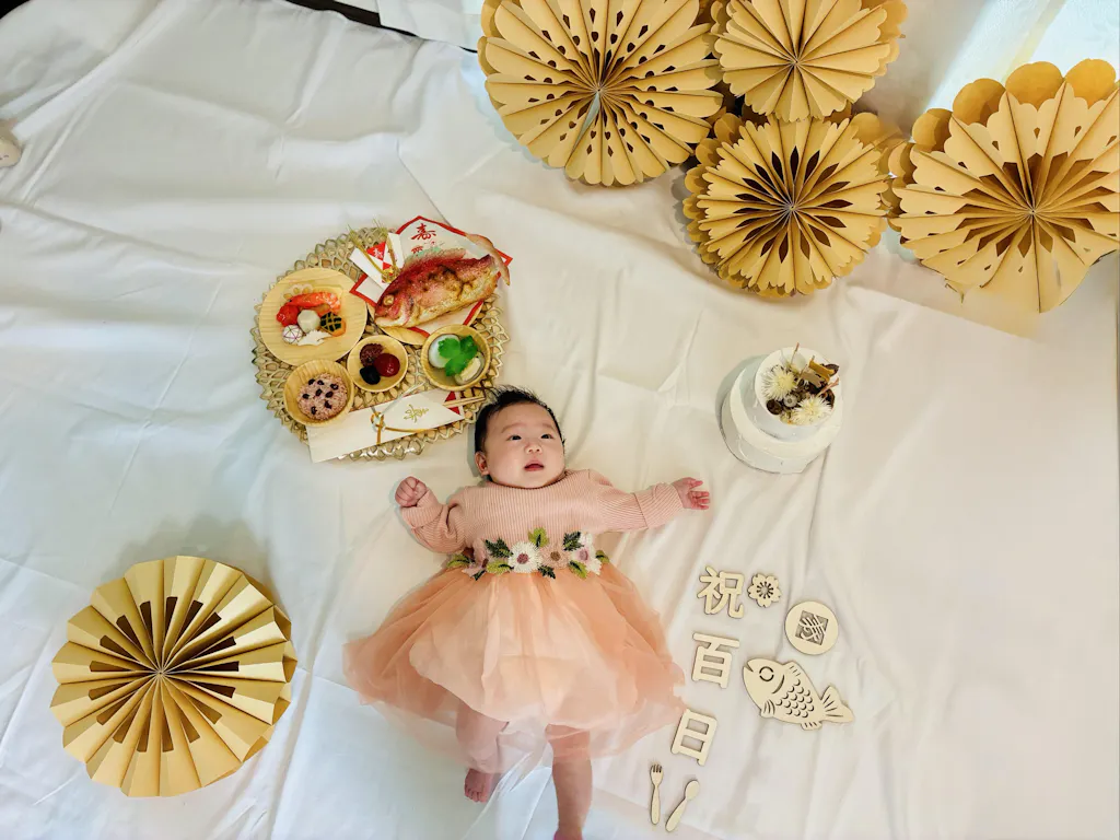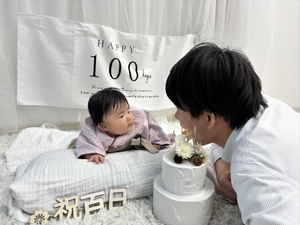 お食い初め100日祝いを記念に残す方法としてレンタルで自由な時間に自宅で撮影ができるのがとても魅力的でした。娘が良い笑顔でいてくれて、家族の思い出に残る写真がたくさん撮れて大満足です!!!素敵な機会をありがとうございました。