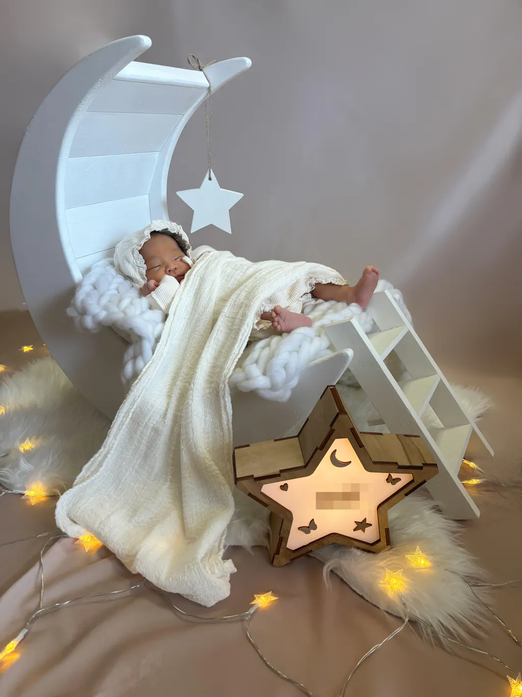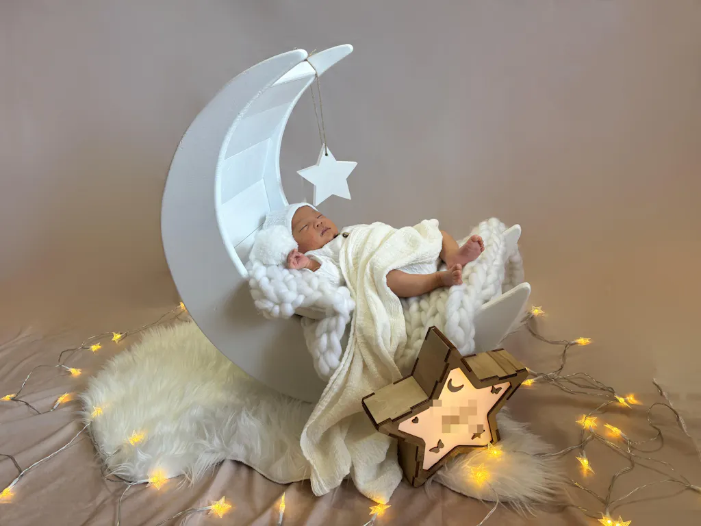 注文からすぐに対応していただき大変助かりました。三日月に乗る姿は他とは被らず、とてもいい思い出が残せました。組み立て方法や写真の撮り方や片付け方法が丁寧に記載されており、産後一人でスムーズに組み立て→撮影→梱包することができました。