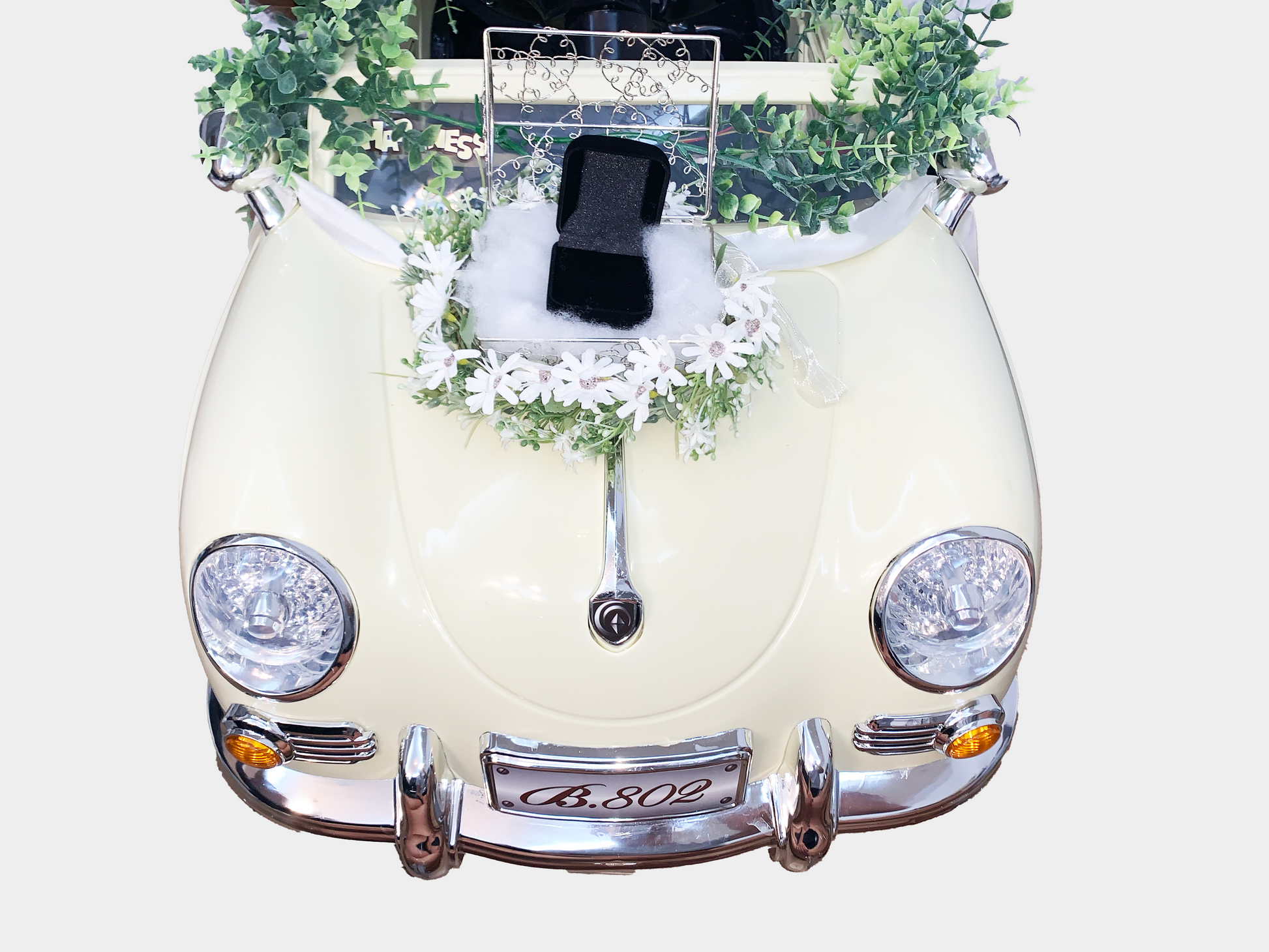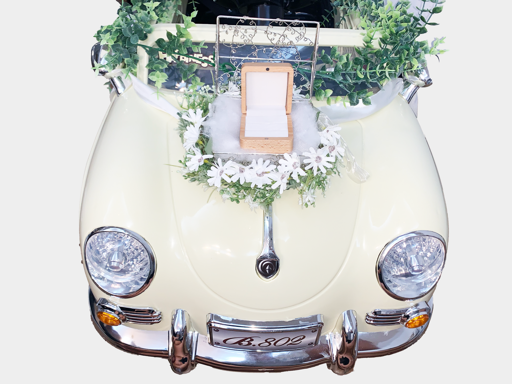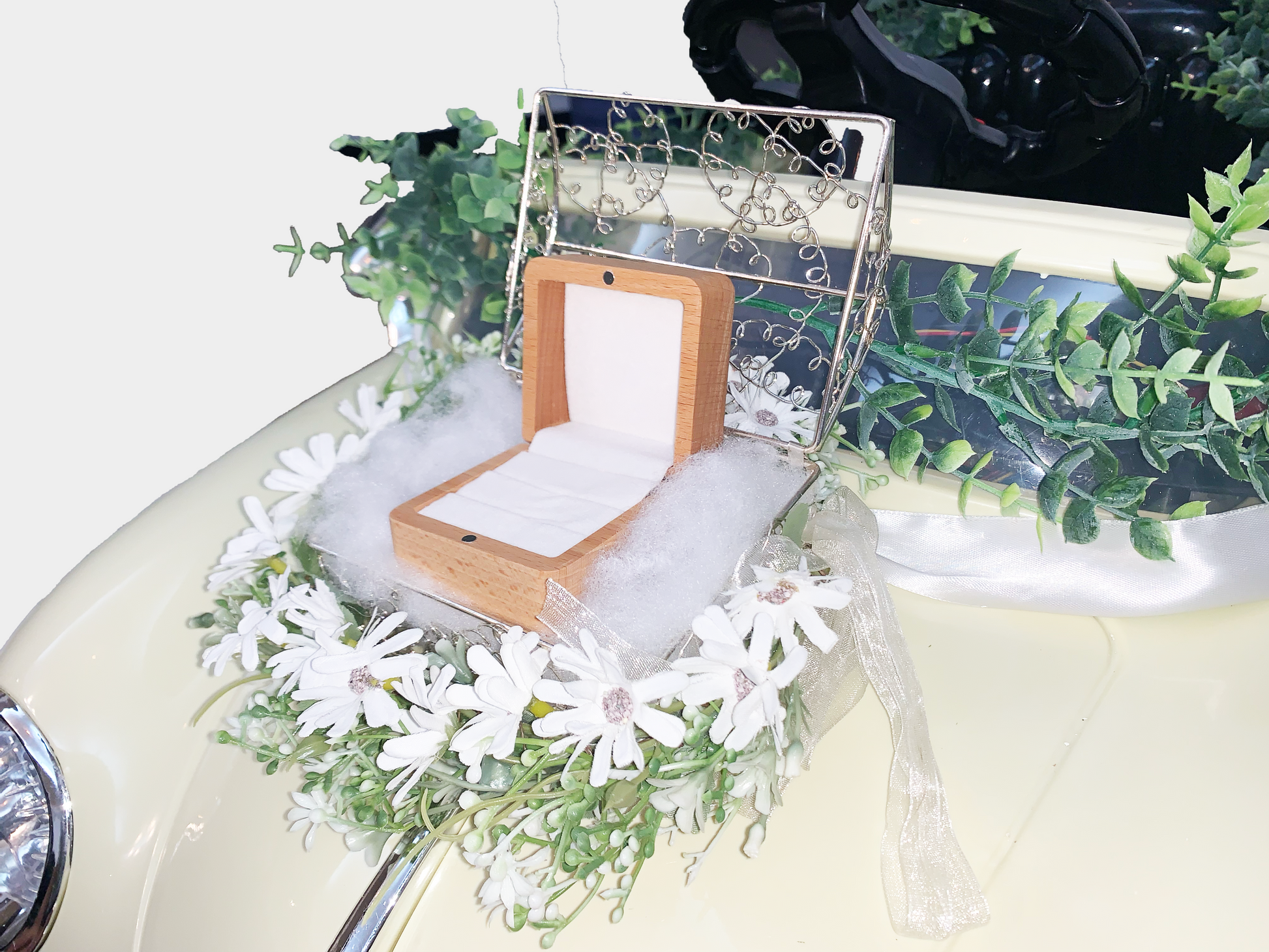 1. 車体前部:銀ワイヤーの箱と花(指輪ケース非付属)